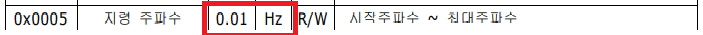 ⓓ 데이터는 십진수 2000의 값에 대한 16진수 데이터 0x07D0의 값이 들어간다. 위에서 설명 했다 시피 문자화 된 헥사값을 넣어야 인버터에서 해석을 해 주파수 20.00이 들어간다. 왜 20.00이 들어가냐면 아래의 그림을 보자.