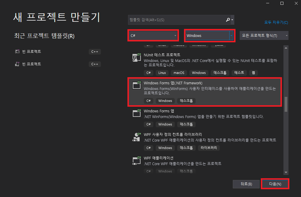 그다음 비쥬얼 스튜디오 2019를 켠다. 그다음은 순서대로 하면 됌(여기선 C#으로 함)