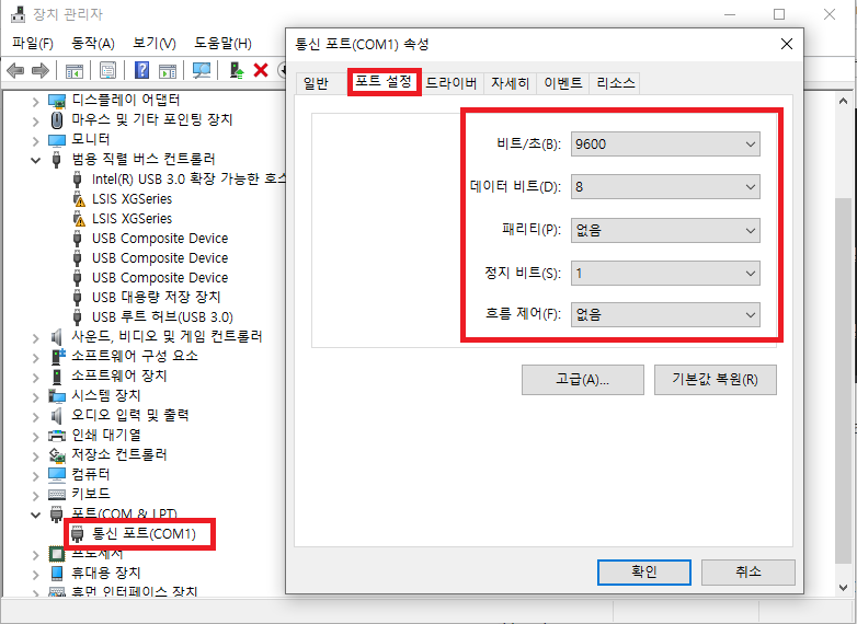 설정하는 PortName , BaudRate, DataBits , Parity, StopBits는 장치관리자에 연결된 COMPort 속성이 가면 있다.